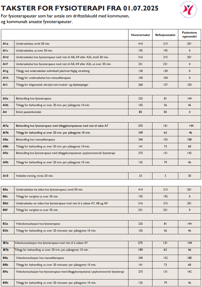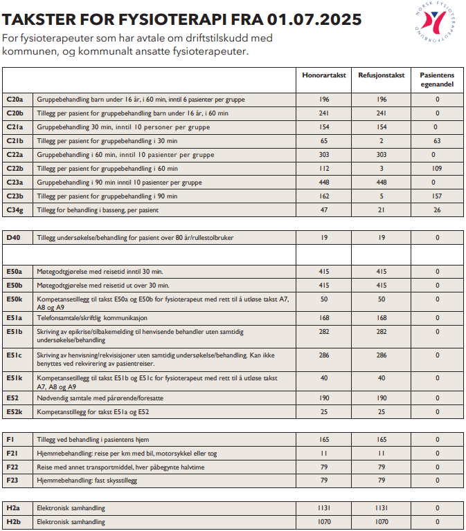 Nedenfor følger gjeldende takster. Du kan laste de ned selv her: https://aktuelt.fysio.no/hubfs/Takstplakat%202025.pdf